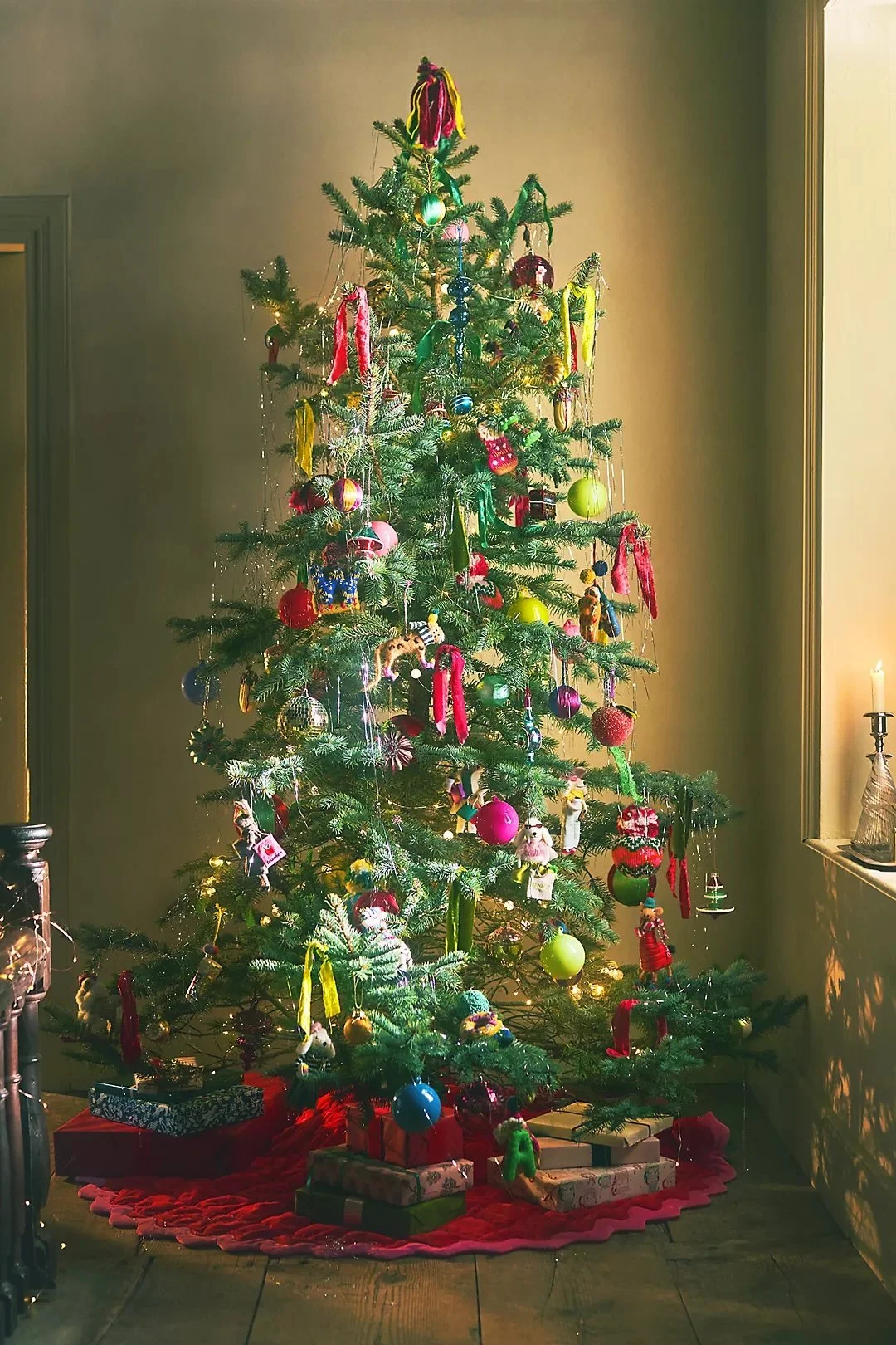 You can find dozens of Christmas trees on TikTok adorned in muilticolor velvet ribbon bows (and tinsel) in instead of (or in addition to) classic ornaments. This gives the tree a vintage-y look — especially if you use ribbon that strays outside the usual red-and-green vibe. Try chartreuse, blue, or pink to spruce up your spruce. Or tie some velvet bows around mantle and stairway garlands.