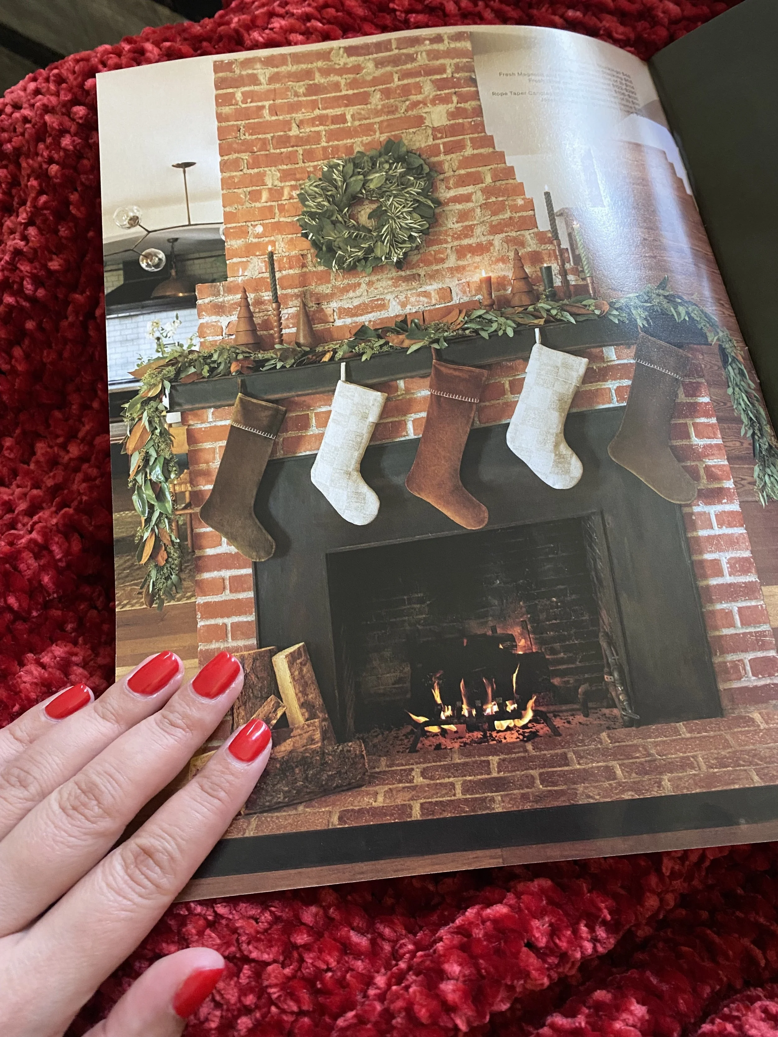 Another popular shade this season? Brown. Now, neutral isn’t really my vibe, but I can’t deny that greenery like trees and garlands go great with an earthy brown tone. You’ll probably see browns used as an accent to deep burgundies and rich greens in the form of ornaments, accent ribbons, or stockings like in the below Lulu and Georgia catalogue. (I did see one person on TikTok with a fully brown Christmas tree, though, so to each their own.)